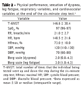 The 6MST was performed in accordance with methods described elsewhere.(19) At the end of every minute, standard phrases of encouragement were provided. At the end of every two minutes, SpO2 was measured with a pulse oximeter (Model 2500; Nonin Medical Inc., Minneapolis, MN, USA), HR was measured with an HR monitor (Model Vantage NVT 1901001; Polar, Kempele, Finland), and sensation of dyspnea and leg fatigue were measured by the 10-point Borg category-ratio scale. Those measurements, together with measurements of systolic blood pressure, diastolic blood pressure, and RR, were performed at rest and immediately after the test, as well as at recovery minutes 1, 3, and 6.