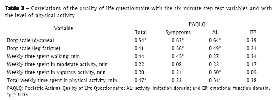 Neither the total PAQLQ score nor the PAQLQ domain scores correlated with the total number of times that the individual being tested went up and down the step during the 6MST or with pre- or post-test RR, HR, systolic blood pressure, diastolic blood pressure, and FEV1. The values obtained at the end of the 6MST are shown in Table 2. Sensation of dyspnea correlated negatively with the total PAQLQ score and with the scores of the PAQLQ activity limitation and symptoms domains, leg fatigue also correlating negatively with those same domains (Table 3).