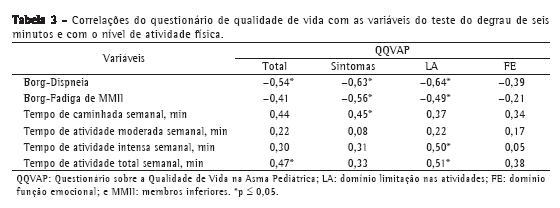 A gravidade da doença e a diminuição da capacidade ao exercício podem afetar a vida social, educacional e emocional desses indivíduos, fazendo com que a criança ou o adolescente asmático tenha uma significativa pior qualidade de vida que os não asmáticos.(5,6) Dessa forma, para o tratamento geral da asma, é importante identificar e tratar os fatores que afetam a qualidade de vida desses indivíduos.(7) Além disso, os parâmetros clínicos de avaliação, tais como sintomas, frequência do uso da medicação e medidas de fluxo aéreo, não mostram uma forte relação com a qualidade de vida, não refletindo de fato as percepções e as limitações que os asmáticos podem apresentar em suas atividades diárias.(7,8) Portanto, torna-se importante verificar se medidas objetivas de avaliação da capacidade ao exercício refletem o impacto da doença na qualidade de vida, a fim de melhor avaliar esses indivíduos e orientar a prescrição de um programa de reabilitação adequado às suas limitações individuais e gravidade da doença.