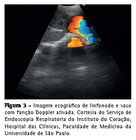 A passagem do aparelho pela laringe deverá ser realizada com cautela, uma vez que o equipamento possui visão oblíqua e o probe ultrassonográfico encontra-se posterior à visão endoscópica. Em seguida, deve-se procurar a imagem ultrassonográfica da lesão a ser diagnosticada ou a primeira cadeia linfonodal a ser puncionada. Após o contato entre a extremidade do equipamento e a parede traqueobrônquica, o balão deverá ser preenchido com água destilada, de forma que o probe ultrassonográfico fique totalmente encostado à parede traqueal ou brônquica, buscando-se assim a melhor janela ecográfica para a visualização da lesão ou do linfonodo antes da punção. A profundidade ultrassonográfica de 3 ou 4 cm é suficiente para o objetivo do exame. A partir desse momento, o ganho, o contraste e o brilho da imagem ultrassonográfica podem ser ajustados objetivando a melhor definição de imagem da lesão ou estrutura. O uso de Doppler é recomendado para a diferenciação entre estruturas sólidas (linfonodo ou tumor) e estruturas vasculares (Figura 3).(6)