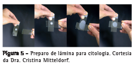 Após a deposição da gota espessa ou fluida sobre a lâmina de citologia, outra lâmina ou lamínula é apoiada sobre a primeira lâmina em um ângulo de 45° ou em paralelo, sendo delicadamente arrastada por toda a lâmina de base até a sua extremidade oposta, permitindo que a amostra líquida se espalhe uniformemente (Figura 5). Para amostras semissólidas, procede-se de forma semelhante, com o cuidado de que grumos e pequenos fragmentos sólidos que restem ao final da gota sejam delicadamente comprimidos ou retirados da lâmina com uma agulha e colocados em líquido fixador para o emblocado celular em parafina.