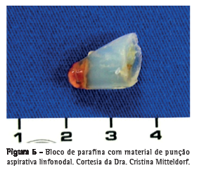 Amostras sólidas são colocadas em frasco com líquido fixador e posteriormente centrifugadas, concentrando o material celular que estava em suspensão após a lavagem da seringa e agulha. Os fragmentos juntamente com o sedimento resultante (pellet) são emblocados em parafina como "mini-biópsias" (emblocado celular; Figura 6), propiciando a elaboração de cortes histológicos que serão submetidos a métodos histoquímicos (colorações de rotina, H&E ou colorações específicas) ou imuno-histoquímicos (Figura 7).(8)