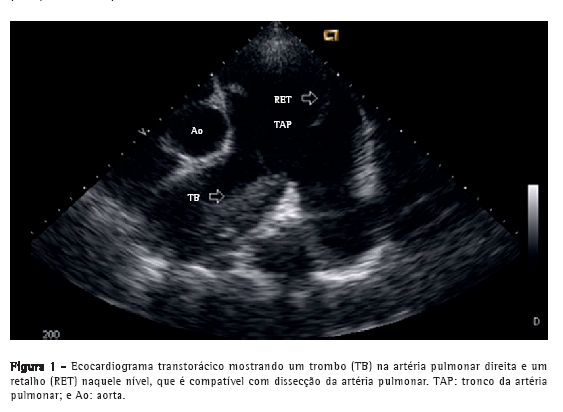 Paciente do sexo masculino, 50 anos, diagnosticado há quatro anos com hipertensão pulmonar relacionada à esquistossomose mansoni, admitido na emergência do Hospital das Clínicas da Faculdade de Medicina da Universidade Federal de Minas Gerais, localizado em Belo Horizonte, Brasil. Apresentava dor torácica retroesternal de início recente com agravamento progressivo e falta de ar (hipertensão pulmonar classe funcional III, de acordo com a Organização Mundial de Saúde). Havia sido diagnosticado com leucemia mieloide crônica há sete meses e estava em quimioterapia desde então. No momento da internação, o ecocardiograma transtorácico mostrava um grande trombo central não obstrutivo na artéria pulmonar principal direita. O átrio direito estava dilatado, e havia regurgitação tricúspide leve, com pressão sistólica em artéria pulmonar estimada em 63 mmHg. Foi diagnosticado como portador de trombose in situ como complicação de hipertensão pulmonar de longa duração. Após a possibilidade de síndrome coronária aguda ter sido excluída, recebeu alta em uso de varfarina. Foi reinternado dois meses depois em razão de dor torácica refratária com agravamento progressivo. Na época, apresentava SpO2 de 96%, e uma terceira bulha era audível no espaço paraesternal esquerdo inferior, acompanhada por murmúrio de regurgitação tricúspide. Os pulmões estavam limpos, e os pulsos arteriais periféricos estavam simétricos. Os exames laboratoriais estavam normais, incluindo os níveis séricos de creatinoquinase, creatinoquinase isoenzima MB e troponina. O eletrocardiograma de repouso evidenciava isquemia miocárdica aguda nas derivações anteriores. O ecocardiograma Doppler transtorácico revelava pressão sistólica da artéria pulmonar de 62 mmHg, um trombo na artéria pulmonar direita, como no exame anterior, e a presença de um retalho naquele nível que era compatível com dissecção da artéria pulmonar (Figura 1). O diagnóstico foi subsequentemente confirmado por angiografia pulmonar por TC (APTC; Figura 2). O paciente foi transferido para outro centro de tratamento cardiovascular, onde foram realizadas tentativas de correção do defeito por meio de um procedimento endovascular (através da veia femoral). No período perioperatório, o paciente apresentou choque cardiogênico refratário. Todos os esforços para reanimar o paciente foram infrutíferos, e ele faleceu na sala de cirurgia.