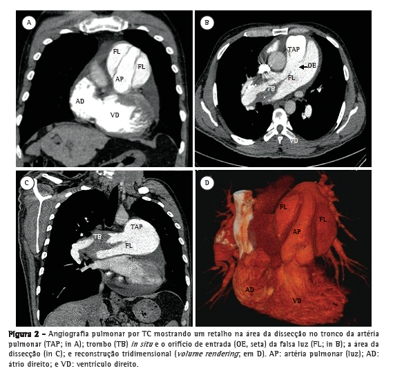 Até onde sabemos, este é apenas o segundo relato de um caso de dissecção da artéria pulmonar em paciente com hipertensão pulmonar relacionada à esquistossomose, sendo que o primeiro caso foi diagnosticado em autópsia.(6) Clinicamente, esses casos apresentam agravamento de sintomas anteriores de dispneia e dor torácica. A dor torácica é normalmente acentuada e pode simular síndrome coronariana aguda ou dissecção aguda da aorta. Cianose pode estar presente.(7) O diagnóstico é muitas vezes obtido post mortem, pois a maioria dos pacientes morre subitamente em razão de tamponamento cardíaco ou sangramento pulmonar grave. Se o diagnóstico é feito ante mortem, o primeiro achado é a emergência de um retalho na luz da artéria ou tronco pulmonar dilatado que se forma a partir da camada da íntima, denotando o orifício de entrada da falsa luz, mas raramente uma saída, que é o oposto do que é encontrado em casos de dissecção aórtica.(8) A ressonância magnética ou a APTC de tórax podem confirmar o diagnóstico e as complicações associadas, como aumento da dilatação da artéria pulmonar, sangue no líquido pleural e opacidades pulmonares.(1) A evolução é geralmente a ruptura do vaso com sangue se espalhando para o mediastino, pericárdio ou pulmão, pois não há saída da falsa luz. O orifício intimal que leva à dissecção ocorre no ponto de maior dilatação como consequência de um aumento da tensão parietal. Há relatos de que a inflamação causada por trombose in situ pode desempenhar um papel sinérgico no desenvolvimento da ruptura intimal.(4,9,10)