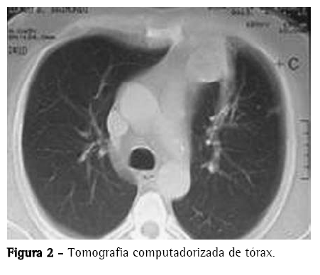 A radiografia de tórax mostrava opacificação nodular no terço médio de hemitórax esquerdo, em projeção lingular, com cerca de cinco centímetros de diâmetro (Figura 1), que foi confirmada pela tomografia de tórax (Figura 2). Foram realizados, ainda, pesquisa do bacilo de Koch no escarro, que resultou negativa, além do derivado protéico purificado, não reativo. A broncoscopia evidenciou restos hemáticos em segmento brônquico lingular, sem outras alterações.