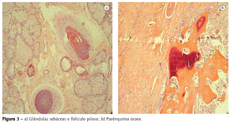 Diante da premente necessidade diagnóstica e terapêutica, foi indicado o procedimento operatório. Foi realizada uma toracotomia inframamilar esquerda e visualizou-se tumor em região lingular, optando-se por segmentectomia. A biópsia de congelação resultou negativa para neoplasia, sendo o restante da peça enviado para estudo anatomopatológico. O paciente evoluiu bem, recebendo alta hospitalar no 3º dia pós- operatório. O exame anatomopatológico demonstrou peça nodular que pesava 25 g, media 5 × 4,5 × 3,5 cm, com superfície lisa, de coloração acastanhada, com tecidos pulmonares e adiposos aderidos. A margem pulmonar distal apresentou-se normal. A microscopia mostrou tecidos epiteliais maturos como pancreático, epiderme, glândulas sebáceas e tecidos mesenquimais maturos, como ósseo e cartilaginoso (Figura 3), concluindo-se por teratoma maturo intrapulmonar primário.