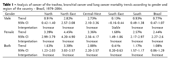 According to some researchers,(8) the investigation into the historic tendency of health-related events, among which lung cancer mortality can be included, enables a more adequate analysis of health risk control measures, as well as allowing possible changes in their epidemiological structure to be detected. Therefore, the objective of this study was to analyze the temporal trends and geographic distribution of mortality from cancer of the trachea, bronchial cancer, and lung cancer in Brazil from 1979 to 2004.