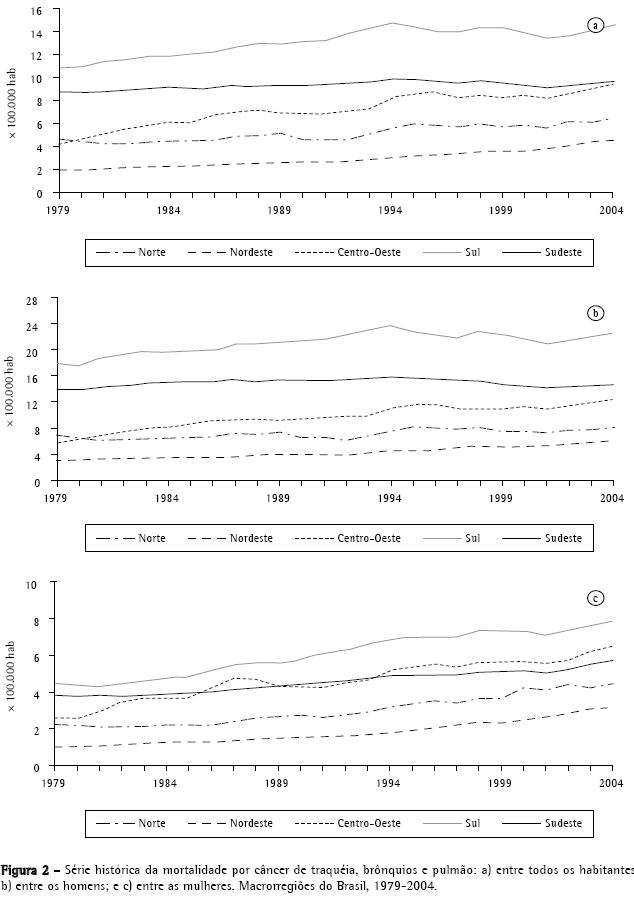 A análise da tendência de acordo com o sexo e as diferentes regiões do país demonstrou que apenas entre os homens do sudeste houve estabilidade na mortalidade por câncer de traquéia, brônquios e pulmões entre 1979 e 2004. Nas demais regiões e em ambos os sexos, a tendência foi de aumento. No nordeste foi identificado o maior aumento de mortalidade no período (3,30% ao ano), tanto para o sexo masculino (2,82% ao ano) quanto para o feminino (4,45% ao ano). Na seqüência aparecem as regiões centro-oeste, norte e sul, com aumentos anuais de 2,88%, 1,63% e 1,17%, respectivamente, quando analisados ambos os sexos em conjunto. Os incrementos nas taxas de mortalidade foram, em todas as regiões, maiores entre as mulheres (Tabela 1).