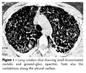 Small nodules were identified in 70% of the patients. The small nodules seen on the HRCT scan correspond to dense micronodules (<1 mm), on chest X-rays and are very thin, well-defined, and diffusely spread throughout the parenchyma, making the lungs homogeneously hypotransparent, characterizing the pattern described by some authors as a 'sandstorm' aspect, which is considered typical of the disease. When this pattern is identified in chest X-rays, lung biopsy is needed only in exceptional cases.(1-4) On the HRCT scan, it is often impossible to define the calcium density of the nodules. This is probably due to their small dimensions. When they converge, calcium can be better characterized.