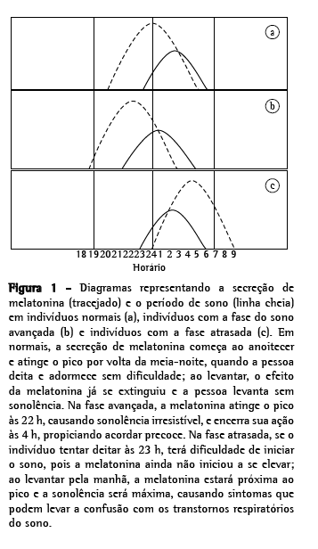Entre as causas não-respiratórias de insônia e sonolência, talvez as mais negligenciadas sejam aquelas relacionadas aos circadian rhythm sleep disorders (CRSDs, transtornos do sono relacionados ao ritmo circadiano). Estes transtornos se manifestam por desalinhamento entre o período do sono e o ambiente físico e social de 24 h, relacionado a alterações dos sistemas de temporização internos. Existem dois padrões freqüentes destes transtornos, vistos principalmente no adolescente e no idoso. A queixa do adolescente pode simular quadro de insônia quando deita no horário normal e demora horas para adormecer, mas também simula sonolência quando ele não consegue levantar pela manhã. O quadro do idoso pode aparentar sonolência quando ele adormece às 20 h, assistindo televisão, mas também aparenta insônia ao acordar de madrugada, sendo incapaz de voltar a dormir (Figura 1). Estes casos de falsa insônia ou sonolência são, na verdade, os modelos mais comuns de CRSD, com sérias conseqüências para a qualidade de vida do indivíduo. Por isso, devem estar sempre em mente no diagnóstico diferencial de SAHOS.