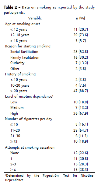 The high rate of SRDs in the present study (69.8%), especially considering the relatively low mean age (48.1 years), as reported in other studies,(22) underscores the importance of expanding the strategies for treating smoking, minimizing the hazards associated with smoking (morbidity and mortality) and therefore minimizing the individual and collective costs of this dependence.