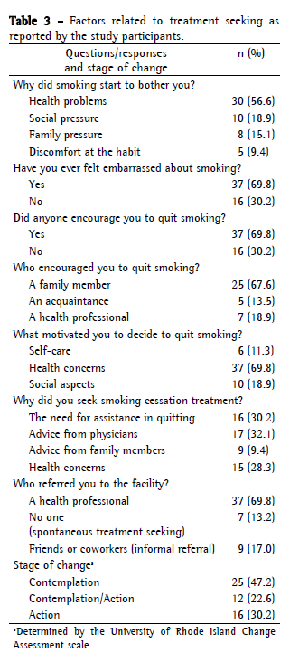Objective: To describe the reasons smokers give for seeking smoking cessation treatment, correlating those reasons with sociodemographic characteristics, clinical data, stage of readiness to change, and severity of nicotine dependence. Methods: Between February of 2008 and February of 2009, we evaluated 53 smokers who were naive to smoking cessation treatment and sought such treatment at the psychoactive substance abuse outpatient clinic of a university general hospital. The instruments used in the study were as follows: a form for the collection of sociodemographic and clinical data; the Fagerström Test for Nicotine Dependence; the University of Rhode Island Change Assessment scale; and a questionnaire on the smoking habit. Results: The sample comprised 34 women and 19 men, with a mean age of 48.1 years. Most of the participants had less than 8 years of schooling, had tobacco-related diseases, started smoking during adolescence, had smoked for more than 20 years, and had high nicotine dependence. The decision to quit smoking was mainly influenced by advice from family members, and the decision to seek specialized smoking cessation treatment was influenced by physicians. Most of the men were in the contemplation stage of change, whereas the women tended to have a more balanced distribution of the stages (p = 0.007). The women had attempted to quit smoking more often than had the men (p = 0.017) and also had a higher level of nicotine dependence (p = 0.053). Conclusions: The findings of this study highlight the role of health professionals in the approach to smoking cessation and suggest the importance of interventions that are more targeted, in view of the differences between men and women.