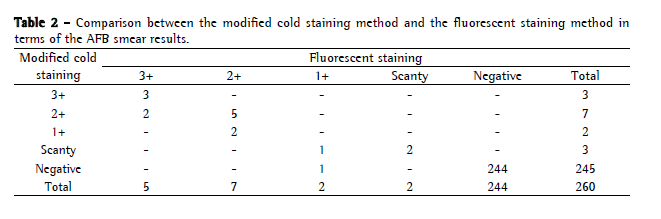 Objective: In developing countries, sputum smear microscopy is the main tool for pulmonary tuberculosis case finding. The objective of the present study was to evaluate the diagnostic efficacy of Gabbett's staining (GS) and modified cold staining (MCS), both of which are two-step methods, in comparison with that of fluorescent staining (FS), which is a three-step method, for the detection of AFB in sputum smears. Methods: Our sample comprised 260 sputum samples collected from individuals suspected of having pulmonary tuberculosis at Kasturba Hospital, in Manipal, India. Smears were prepared in triplicate: one each for FS, MCS, and GS. The smears were randomly numbered so that the examiner was blinded to the sample identities. Results: Of the 260 samples, 16 (6.15%), 15 (5.77%), and 13 (5.00%) showed positive AFB results with FS, MCS, and GS, respectively. The sensitivity of GS and MCS, in comparison with that of FS, was 81.25% and 93.75%, respectively. The concordance of GS and MCS with FS was good (0.988 and 0.996, respectively), and no statistically significant differences were found. Conclusions: Although MCS and GS were found to be less sensitive than was FS, which is evaluated under fluorescence microscopy, the first two are promising methods for the diagnosis of tuberculosis.