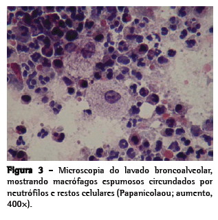 Por haver recorrência do quadro, foi realizada uma biópsia pulmonar a céu aberto, cujo estudo histopatológico revelou um denso infiltrado inflamatório linfoplasmocitário peribronquiolar e granuloma lipídico, levando ao diagnóstico de pneumonia lipoide (Figura 2). O diagnóstico foi confirmado pelo estudo do lavado broncoalveolar, que mostrou macrófagos espumosos circundados por neutrófilos e restos celulares (Figura 3).