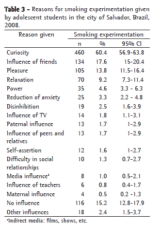 Among the reasons that the adolescents in the sample gave for smoking experimentation, the most common was "curiosity", with a lower proportion of responses mentioning "no influence". Other reasons given were the effect of nicotine (pleasure and relaxation) and the influence of friends (Table 3).