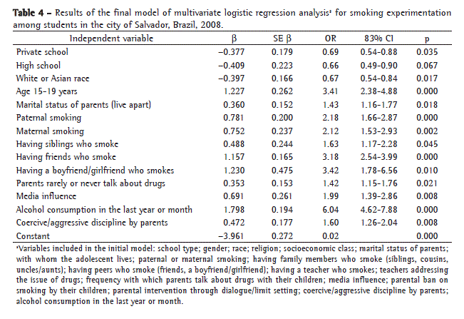 In the multivariate analysis, the private school students, the high school students, and those who self-reported being White or Asian had negative beta values. In the final model, being between 15 and 19 years of age, having separated parents, having family members or peers who smoke (father, mother, siblings, friends, or a boyfriend/girlfriend), having parents who rarely or never talk about drugs, being influenced by the media, and being disciplined aggressively/coercively by the parents were found to be associated with smoking initiation (Table 4). Alcohol consumption showed a strong association with smoking experimentation (OR = 6.04; 83% CI = 4.62-7.88).