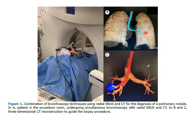 In addition to diagnosis, airway management during interventional procedures represents another point of convergence between these specialties. Bronchoscopy allows intubation of difficult airways and placement of double-lumen tubes during percutaneous interventions (Figure 2). It also plays a role in managing hemoptysis resulting from transthoracic biopsies, assisting with the placement of endobronchial blockers and the application of other hemostatic measures, thus ensuring rapid and effective bleeding control. In turn, interventional radiology promptly detects and treats pneumothorax following transbronchial biopsy by performing image-guided chest tube drainage. This synergy and immediate response enhance safety standards and ensure timely management of adverse events.(3)