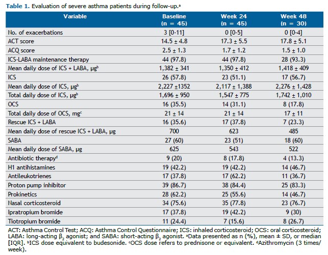 This was a convenience sample. Of a total of 60 severe asthma patients receiving omalizumab or mepolizumab for at least six months in accordance with the 2021 PCDT for asthma,(1) 45 were included. Of those, 11 (18.3%) were excluded because of prior use of another biologic agent, and 4 (6.7%) declined to participate. After patients gave written informed consent, patient medical records and our electronic prescription system were retrospectively reviewed in order to collect data at baseline and at 24 and 48 weeks after initiation of biologic therapy, as well as to assess medical prescriptions. A total of 45 patients were evaluated at baseline and at 24 weeks, whereas 30 patients were evaluated at 48 weeks. This was due to the fact that 15 patients either discontinued therapy because of treatment failure or had an insufficient follow-up period. The data were entered into a Research Electronic Data Capture (REDCap; Vanderbilt University, Nashville, TN, USA) database. The use of other medications was ascertained from previous prescriptions, and short-acting β2 agonist (SABA) doses were recorded from our electronic prescribing system. Adherence to treatment with biologics was assessed on the basis of outpatient clinic attendance.