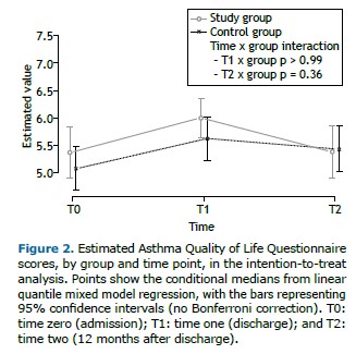 Measurements The following data and assessments were recorded or performed at admission, designated time zero (T0): demographics; anthropometrics; asthma severity according to the GINA guidelines(9); comorbidities, assessed with the Cumulative Illness Rating Scale Severity and Comorbidity Index(19); the Asthma Control Test score(17); steroid use and number of exacerbations in the previous 12 months; dynamic lung volumes according to standards(20) using the predicted values established by Quanjer et al.(21); arterial blood gases; and airway inflammation, identified by measuring the fractional exhaled nitric oxide (FeNO).(22) At discharge (T1), we also applied the Global Perceived Effect scale.(23)