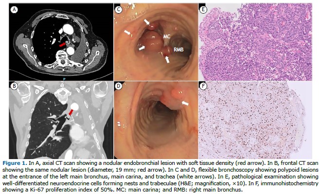 A 78-year-old male with no relevant medical history was diagnosed with atypical carcinoid in 2012 and underwent left upper lobectomy with curative intent. Three years later, the patient presented with a single local recurrence, and a left pneumonectomy was performed. Twelve years after the initial diagnosis, a CT scan was performed because of dyspnea, revealing multiple round lesions in the tracheobronchial tree (Figures 1A and 1B). Bronchoscopy showed several polypoid lesions (Figures 1C and 1D), and cryobiopsies were performed. Pathological examination showed well-differentiated neuroendocrine cells, and immunohistochemistry showed a Ki-67 proliferation index of 50%, as well as positivity for CD56, synaptophysin, and chromogranin A, the final diagnosis being atypical carcinoid (Figures 1E and 1F). During a second bronchoscopy, laser and electrocautery resection of the tracheobronchial lesions was performed.