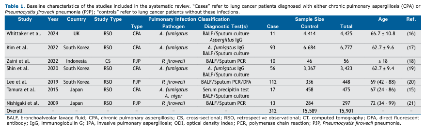 DISCUSSION This systematic review and meta-analysis evaluated the prevalence of fungal pulmonary infections (CPA and PJP) in 15,901 lung cancer patients across seven studies, identifying 312 cases. Key clinical associations were also explored to support risk stratification and management.
