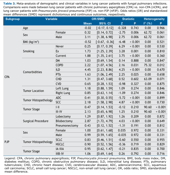 Meta-Analysis of Clinical Predictors of CPA and PJP in Lung Cancer Patients A meta-analysis of dichotomous and continuous outcomes comparing CPA vs. non-CPA and PJP vs. non-PJP lung cancer patients is presented in Table 3, with statistically significant findings visualized as forest plots in Figure 2.