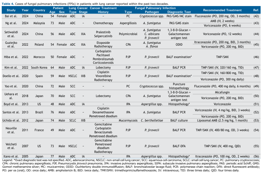 Clinical Remarks and Practical Considerations In routine practice, FPIs in lung cancer are investigated only when clinical or radiologic findings—such as new infiltrates, persistent fevers, or nodular lesions—raise suspicion, rather than through universal screening.(57,58) For PJP, current guidelines recommend initiating prophylaxis once patients receive the equivalent of ≥20 mg prednisone daily for ≥4 weeks or,(60) according to the 2022 European Alliance of Associations for Rheumatology (EULAR) update, ≥15 mg daily for ≥2 weeks.(57) Trimethoprim sulfamethoxazole (TMP/SMX) remains the first line regimen, with dosing adjusted for renal function and desensitization protocols available for sulfa allergic patients. Its efficacy is well supported, including in a recent risk-benefit analysis of primary prophylaxis against PJP involving 419 patients receiving TMP/SMX.(61) Within lung cancer-associated case reports (Table 4), TMP/SMX consistently appears as the predominant treatment modality for PJP, reinforcing its central role. By contrast, CPA typically arises from structural lung damage—such as post radiotherapy pneumonitis or bilobectomy—and routine antifungal prophylaxis is neither standard nor practical given concerns about toxicity, drug interactions, and cost. (57) Instead, our findings suggest a risk stratified surveillance approach: patients undergoing high risk interventions, including bilateral lung resections or CCRT, may benefit from scheduled chest imaging or serum biomarkers (e.g., galactomannan, Aspergillus PCR; see Table 1) in the months following treatment to enable earlier CPA detection. Together, these observations support targeted PJP prophylaxis and individualized CPA monitoring strategies to optimize fungal infection management in lung cancer care.