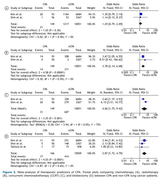 Treatment-Associated Risk of CPA in Lung Cancer Patients As shown in Figure 3, chemotherapy was not significantly associated with CPA in patients with lung cancer (OR: 1.29; 95%CI: [0.79–2.09]). In contrast, chest radiotherapy showed a significant association with CPA (p<0.001), with a pooled OR of 3.78 (95%CI: [2.14–6.68]) and negligible heterogeneity (I² = 0%). Concurrent chemoradiotherapy (CCRT) also showed a significant association (p=0.001), with a pooled OR of 4.06 (95%CI: [1.75–9.42]), though with substantial heterogeneity (I² = 75%).