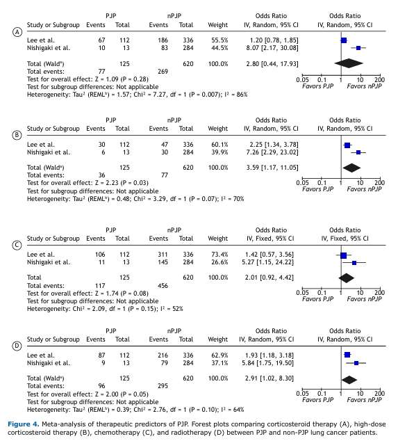Treatment-Associated Risk of PJP in Lung Cancer Patients Overall, corticosteroid therapy was not significantly associated with PJP in lung cancer patients (OR: 2.80; 95%CI: [0.44–17.39]; Figure 4). However, high-dose corticosteroid use—defined as a daily dose of ≥20 mg—was significantly associated with increased odds of PJP (p=0.03), with a pooled OR of 3.59 (95%CI: [1.17–11.05]) and moderately high heterogeneity (I² = 70%).