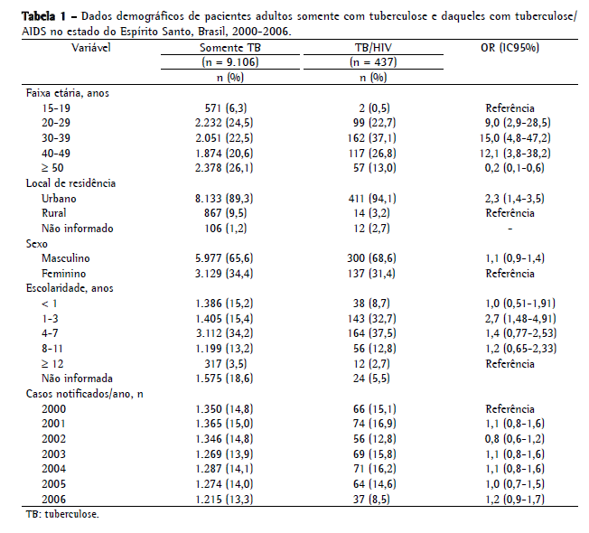 Um total de 9.958 casos de TB foi notificado ao Centro de Vigilância Epidemiológica do Estado do Espírito Santo durante o período do estudo, 9.543 dos quais em pacientes acima dos 15 anos de idade, que foram incluídos no presente estudo. A média de idade desses pacientes foi de 38 anos (II, 27-50 anos). Os pacientes com TB/AIDS totalizaram 437 (4,6%; IC95%: 2,7-6,5%). Portanto, houve 9.106 casos somente de TB e 437 casos de TB/AIDS. Desses 437 casos, 26 (6,0%) não estavam registrados no banco de dados para TB.