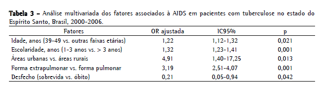 Quanto ao desfecho do tratamento nos pacientes com TB/AIDS, 48,5% foram curados da TB, 8,9% abandonaram o tratamento, 8,2% foram transferidos para outros locais, 0,5% desenvolveram TB multirresistente, e 28,8% foram a óbito (Tabela 1). A Tabela 3 mostra a análise multivariada dos fatores associados à AIDS nos pacientes com TB de nossa amostra.