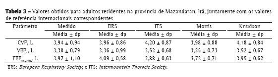 Há diferenças significativas entre os valores de referência, dependendo das fórmulas empregadas. Para serem generalizáveis, esses valores devem ser obtidos pelo estudo de amostras representativas da população geral.(2) Recomenda-se que esses padrões sejam estabelecidos pelos governos.(1) Atualmente é aceito que centros de referência devem produzir valores de referência pelo estudo de amostras de indivíduos saudáveis em sua região.(2) Um estudo envolvendo 41 estudantes de medicina do sexo masculino entre 23 e 26 anos de idade, realizado em 1994 na cidade de Zanjan, no Irã, mostrou que a média da CVF na população estudada foi de 90% do valor previsto.(4) Outro estudo, envolvendo 423 crianças e adolescentes, foi realizado em 2000 na cidade de Isfahan, no Irã.(5) Os autores mostraram que há diferença entre os valores de referência mais utilizados e aqueles obtidos para a população geral do Irã.(5) Um estudo realizado na Espanha por Castellsagué et al. em 1998 demonstrou diferenças entres as etnias em termos dos volumes pulmonares.(6) Gore et al. observaram que os valores de referência mais utilizados eram aplicáveis a indivíduos brancos na Austrália.(7) Em um estudo realizado por nosso grupo em 2006 na cidade de Sari, no Irã, observamos que os valores espirométricos (CVF, VEF1 e FEF25-75%) para adultos saudáveis (≥ 18 anos de idade) eram mais semelhantes aos valores de referência da European Respiratory Society (ERS) que a outros padrões.(8) Fórmulas matemáticas comuns utilizadas para calcular índices espirométricos padrão geralmente se baseiam em valores obtidos para amostras pequenas de indivíduos saudáveis na Europa ou nos Estados Unidos, e esses valores são generalizados para a população mundial, independentemente do fato de que há diferenças antropométricas entre as raças e diferenças ambientais entre as regiões.