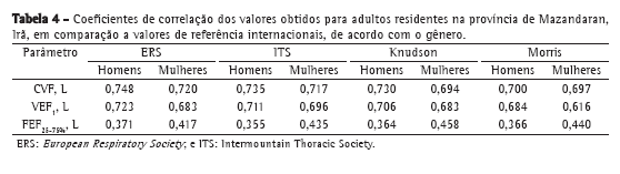 Os valores obtidos para nossa amostra foram comparados aos valores de referência da ERS, da Intermountain Thoracic Society (ITS), da European Community for Coal and Steel (ECCS), de Knudson e de Morris.(2) Utilizando os valores obtidos, também produzimos equações preditivas especificamente para uso na população do Irã.