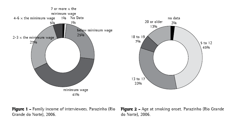 As to the form of tobacco use, the low income of the interviewees probably explains the high percentage of smokers who opted to smoke hand-rolled cigarettes. The literature shows that six hand-rolled cigarettes are equivalent to twenty commercial cigarettes, due to their greater toxicity.(14)