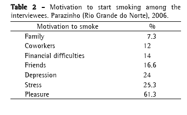 In the city studied, the proportion of individuals who smoked only commercial cigarettes (30.6%) was practically the same as that of the individuals who smoked only hand-rolled cigarettes (29.3%), and 24% of the interviewees reported using both types interchangeably. Regarding the motivation to smoke, Table 2 shows that 61.3% smoked for pleasure, 25.3% associated the habit with stress relief, and 24% smoked because they felt depressed. In some cases, multiple responses were given to this question.