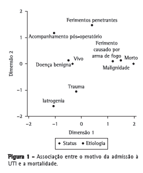 Dos 141 pacientes tratados na UTI, 53 (37,5%) foram admitidos devido a trauma. Todos esses casos envolviam trauma torácico ou apresentavam trauma torácico proeminente. Dos 53 pacientes com trauma, 7 (13,2%) morreram. A Tabela 1 mostra a relação entre os motivos da admissão à UTI e a mortalidade em pacientes que receberam VM invasiva. Dos 141 pacientes, 29 (32,1%) foram admitidos à UTI para acompanhamento pós-operatório após cirurgia de médio ou grande porte. Portanto, era provável que apresentassem problemas respiratórios ou hemodinâmicos graves. Não houve mortalidade durante o acompanhamento dos pacientes submetidos a cirurgia eletiva (ressecções, em 16 pacientes; enfisema, em 4; bulectomia, em 3; e esofagectomia, para abscesso pulmonar, em 6). Dos 141 pacientes, 19 (14,8%) apresentaram ferimentos penetrantes (causados por arma branca), e 4 deles (21%) morreram. Doenças respiratórias como DPOC grave, abscesso pulmonar e empiema foram os motivos da admissão à UTI em 12 pacientes (8,5% da amostra), e 1 deles (8%) morreu. Em 11 pacientes (7,8% da amostra), o motivo da admissão à UTI foi câncer de pulmão primário ou metastático inoperável, e 5 deles (45,4%) morreram. Onze pacientes (7,8% da amostra) foram admitidos à UTI devido a ferimento causado por arma de fogo, e 6 deles (54,5%) morreram. Dos 6 pacientes (4,9% da amostra) admitidos à UTI devido a doenças iatrogênicas (pneumotórax devido a VM invasiva, em 2; hemopneumotórax devido a cateterismo central, em 2; hemotórax devido a cateter, em 1; e pneumomediastino, resultado de uma complicação da traqueostomia, em 1), nenhum morreu. Dentre os diversos motivos pelos quais os pacientes foram admitidos à UTI, ferimento causado por arma de fogo, ferimento causado por arma branca e malignidade apresentaram associação significativa com mortalidade (p < 0,05). A análise de correspondência revelou que motivos específicos de admissão à UTI foram os principais fatores que afetaram a mortalidade (p = 0,003; Figura 1).