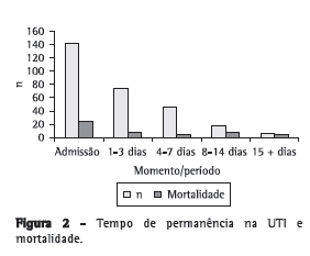 O total de dias na UTI foi de 586, e o tempo médio de permanência na UTI foi de 4,1 dias. A Figura 2 mostra a associação entre o tempo de permanência na UTI e a mortalidade.