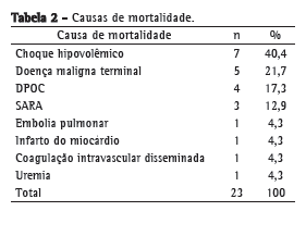 A taxa global de mortalidade foi de 16,3% (23 pacientes), dos quais 12 (51,6%) estavam na faixa etária de 45-69 anos e 7 (30,1%) estavam na faixa etária de > 70 anos. As causas mais comuns foram choque hipovolêmico, em 5 (21,8%) e doença maligna terminal, em 5 (21,8%). As causas de mortalidade e as taxas correspondentes são apresentadas na Tabela 2.