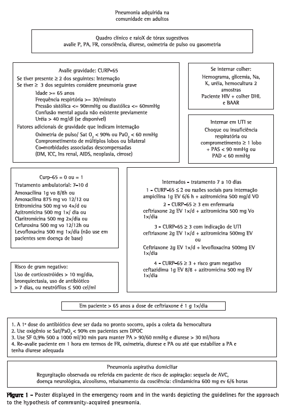 For disseminating these guidelines, we used various strategies, including weekly clinical meetings, in which real cases of hospitalized patients were used for evaluating the guideline recommendations; the distribution of educational material (pocket booklets) containing the guidelines to all professors, attending physicians, emergency room physicians, residents, and internists; and the production of posters summarizing and systematizing the initial approaches to the treatment of patients with CAP (Figure 1). These posters were displayed in the prescription rooms of the wards and the emergency room. All of the educational material was made universally available, for viewing or printing, on the FAMEMA website.