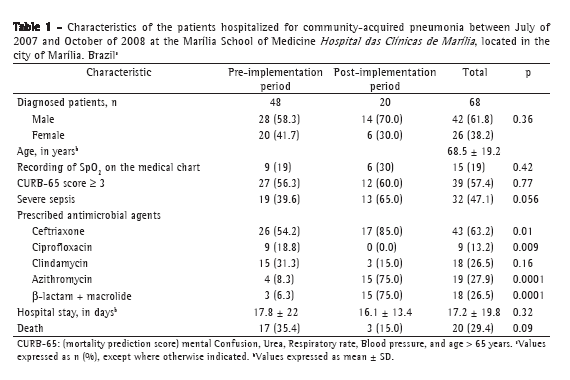 The implementation of the clinical guidelines for CAP resulted in significant advances mainly related to the therapeutic approach. In the post-implementation period, most patients received antimicrobial agents as proposed in the guidelines: 17 (85%) of the 20 patients were treated with a beta-lactam, predominantly a third-generation cephalosporin (ceftriaxone). It is also of note that 75% of the patients received antibiotic therapy for atypical pathogens in the post-implementation period, compared with 6.3% in the pre-implementation period, a difference that was statistically significant (p < 0.001). This finding is extremely important, because the use of second-generation or third-generation cephalosporins in combination with a macrolide has been associated with lower mortality when compared with the use of a cephalosporin alone.(20) Physicians stopped prescribing ciprofloxacin for the treatment of CAP, a finding that is quite relevant given that this drug is ineffective against pneumococci. The increase in the number of diagnosed cases of sepsis/severe sepsis observed after the implementation of the guidelines is probably due to the standardization of a sepsis diagnosis protocol, which did not exist previously, rather than to increased prevalence in itself, and this is a positive change.