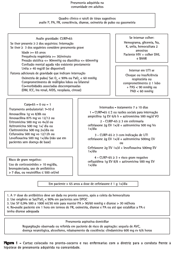 Para disseminar essa diretriz, várias estratégias foram utilizadas, incluindo reuniões clínicas semanais, nas quais casos reais de pacientes internados foram utilizados para a avaliação das recomendações da diretriz; distribuição de material educativo contendo a diretriz, na forma de livretos de bolso, os quais foram distribuídos a todos os docentes, plantonistas, médicos do pronto-socorro, residentes e internos; e confecção de cartazes que sumariavam e sistematizavam as condutas iniciais a pacientes com PAC (Figura 1). Esses pôsteres foram afixados nas salas de prescrições das enfermarias e no pronto-socorro.