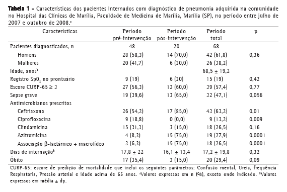 A implementação da diretriz clínica de PAC contribuiu com avanços importantes relacionados principalmente à abordagem terapêutica. No período pós-implementação das diretrizes, a maioria dos pacientes recebeu antimicrobianos em conformidade com o que estava proposto: 17 (85%) dos 20 pacientes foram tratados com um beta-lactâmico, predominantemente uma cefalosporina de 3ª geração (ceftriaxona), sendo que merece destaque a cobertura para germes atípicos, realizada em 75% dos casos no período pós-implantação das diretrizes, em comparação a 6,3% no período pré-implantação, constituindo essa uma diferença estatisticamente significante (p < 0,001). Esse dado é muito importante, pois o uso de cefalosporinas de 2ª ou 3ª geração em conjunto com um macrolídeo tem sido associado à diminuição da mortalidade quando comparado ao uso isolado de uma cefalosporina.(20) Parou-se de usar ciprofloxacina como terapêutica para PAC, dado bastante relevante devido à ausência de ação dessa droga contra o pneumococo.