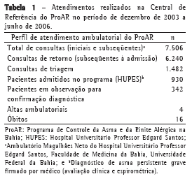 ResultadosPerfil de atendimentos do ProARPacientes asmáticos graves (n = 1.730) receberam assistência multiprofissional de saúde e medicações antiasmáticas gratuitas no período compreendido entre dezembro de 2003 e junho de 2006. Na Central de Referência do ProAR foram assistidos 930 pacientes. As principais características de atendimento na Central de Referência do ProAR estão listadas na Tabela 1.