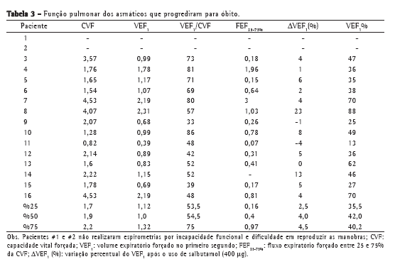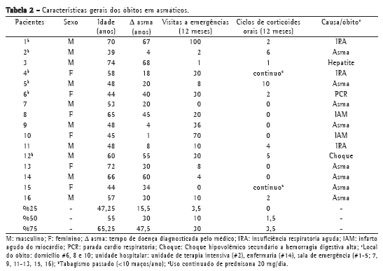 O tempo de acompanhamento desde a admissão no ambulatório do ProAR até a data da morte variou de 3 a 22 meses (mediana, 9 meses). As causas registradas em atestados de óbito foram: 8 (50%) casos de asma ou crise de asma; 3 (18,75%) de insuficiência respiratória; 2 (12,5%) de infarto agudo do miocárdio; 1 de hepatite, 1 de choque hipovolêmico por hemorragia digestiva e 1 de parada cardio-respiratória (6,25%, respectivamente). Dos 16 óbitos, 13 (81,25%) ocorreram dentro de uma unidade hospitalar, em sua maioria em salas de emergência; um óbito ocorreu em enfermaria e um em unidade de terapia intensiva. Os óbitos dos 3 pacientes remanescentes ocorreram em seus respectivos domicílios. As demais características podem ser observadas na Tabela 2.