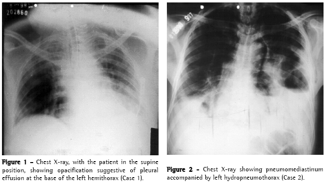 Postemetic rupture of the esophagus accounts for 10% to 15% of all cases of thoracic esophageal perforation and is the third most common cause of this condition.(2) Diagnosis is particularly difficult and is usually delayed since it is a rare disease that can be confused with other serious clinical entities that are more common in emergency situations.(1) Clinical suspicion in relation to this entity is of utmost importance for proper diagnosis. Case 1 was initially diagnosed and treated as acute myocardial infarction and later, based on the clinical and radiological profile presented, as a pulmonary embolism. It was only after a thoracocentesis had been performed, with the discharge of suspicious pleural fluid, and the information that the patient had vomited excessively before the onset of thoracic discomfort became known that the possibility of an esophageal rupture was considered, which was confirmed in the thoracotomy.
