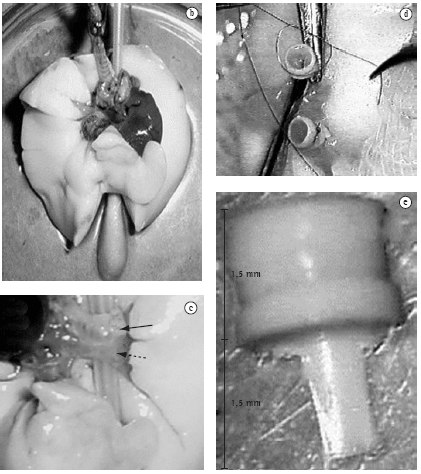 Foram utilizados ratos da raça Wistar pesando entre 300-400 g. Todos os animais foram tratados conforme o Ethical Code for Animal Experimentation da Organização Mundial da Saúde.(14) Cada animal doador era anestesiado em câmara com halotano, seguido por administração de ketamina (50 mg/kg) e xilazina (15 mg/kg), por via intraperitoneal. O animal era traqueostomizado com um cateter de venopunção tipo Abocath® #14 (Abbott Laboratories, Abbott Park, IL, EUA) e submetido a ventilação controlada a volume: capacidade vital, 10 mL/kg; freqüência respiratória, 65 rpm; e pressão expiratória final positiva, 2 cmH2O. Posteriormente, procedia-se uma toracotomia bilateral longitudinal através das linhas hemiclaviculares, com secção transversa ao nível do apêndice xifóide. Após a administração endovenosa de heparina (100 UI/100 g), seccionava-se a veia cava inferior, a aorta torácica e as aurículas direita e esquerda para a perfusão da solução de preservação. Procedia-se com a secção e canulação da artéria pulmonar com um cateter de venopunção #16 (Figura 1a) e iniciava-se a perfusão pulmonar com 20 mL de solução de preservação (Perfadex®; Vitrolife, Göteborg, Suécia) com uma pressão de 30 cmH2O, a 4 °C. Durante todo o procedimento o pulmão era ventilado com oxigênio a 100%. Terminada a perfusão, e com os pulmões semi-insuflados, ligava-se a traquéia e procedia-se a extração do bloco cardio-pulmonar. A seguir, eram isolados os elementos do hilo pulmonar esquerdo (Figuras 1b e 1c) e inseridos os cuffs (confeccionados a partir de cateteres de venopunção #14 ou #16 com 3 mm de extensão, que apresentam uma lingüeta na sua base com 1,5 mm) (Figura 1e). O cuff #16 era sustentado pela sua lingüeta e com o auxílio de duas pinças microcirúrgicas a artéria pulmonar passava através do cuff, e invertia-se o endotélio desta ao redor da circunferência do cuff, sendo esta fixada por um fio monofilamentar 7-0 ou 8-0 (Figura 1d). O mesmo procedimento era realizado para o brônquio e veias pulmonares utilizando cuffs #14. Após o preparo do pulmão para transplante, este era armazenado a temperaturas entre 4 °C e 8 °C por períodos variáveis de tempo, dependendo do objetivo de cada experimento.