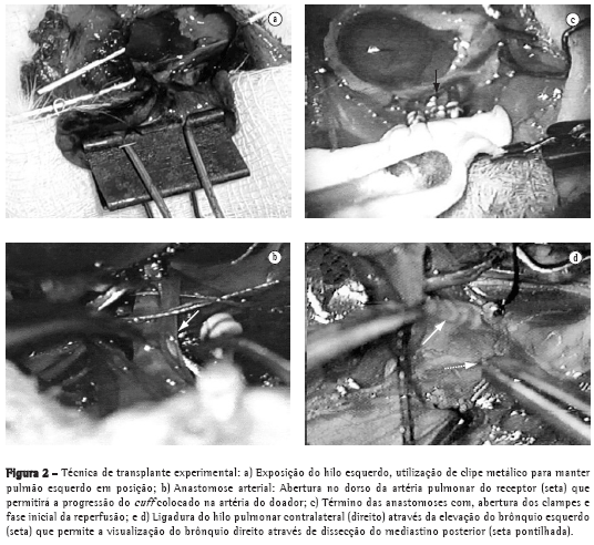 O animal receptor era sedado, anestesiado e intubado via orotraqueal. Posteriormente, eram selecionados os parâmetros ventilatórios previamente descritos para o doador e canulada a artéria carótida direita ou esquerda, com um Abocath® #24 para monitorização hemodinâmica. O animal, em decúbito lateral direito, era submetido a uma toracotomia póstero-lateral esquerda no 5º espaço intercostal. Após liberado o ligamento pulmonar, o pulmão esquerdo era exteriorizado e mantido fora da cavidade torácica por um clipe metálico (Figura 2a). Depois de isoladas as estruturas hilares (artéria, brônquio e veia), estas eram clampeadas com um clampe hemostático. Estas estruturas eram envolvidas com um fio de sutura de 7-0 ou 8-0 pronto para ser amarrado assim que cada estrutura fosse canulada. O implante iniciava-se através da secção da parede lateral da artéria na sua porção ventral, progredindo-se cuidadosa e lentamente o cuff da artéria do doador para dentro da artéria receptora e a fixação desta com aquele fio de sutura colocado previamente ao redor da artéria (Figura 2b). Este mesmo procedimento era realizado para o brônquio e a veia, respectivamente e nesta ordem. Uma vez implantado o pulmão, procedia-se com a abertura do clampe brônquico, seguido da veia e artéria respectivamente (Figura 2c), com posterior retirada do pulmão esquerdo do receptor. Após o término do transplante, era realizado o clampeamento do pulmão contralateral. Esta variante do modelo original permite a avaliação exclusiva do pulmão transplantado (Figura 2d). Este procedimento é realizado pela mesma incisão da toracotomia, retraindo-se o pulmão transplantado em projeção anterior com o auxílio de um cotonete, disseca-se a face mediastinal posterior, permitindo a identificação do hilo pulmonar direito e facilitando o seu clampeamento. A oclusão do hilo pulmonar direito pode ser realizada em bloco ou efetuada apenas a ligadura da artéria pulmonar direita. Esta variação depende exclusivamente do objetivo do estudo a ser realizado. Quando realizada a oclusão total do hilo pulmonar, deve-se reduzir o volume de ar corrente para 5 mL/kg, para evitar a hiperinsuflação do pulmão transplantado e conseqüente lesão induzida pelo ventilador. Na eventualidade de ligadura da artéria pulmonar contralateral apenas, o volume corrente permanece o mesmo. Também podem ser realizados clampeamentos temporários da artéria pulmonar direita com o objetivo de coletar gasometrias arteriais que representem apenas a troca gasosa do pulmão transplantado. Após realizado o transplante e o clampeamento hilar contralateral, o pulmão é insuflado e a parede torácica fechada por planos. Terminado o período de observação, é realizada a extração do bloco cardiopulmonar sendo este fixado em paraformaldeído a 4% ou armazenado a -70 °C.