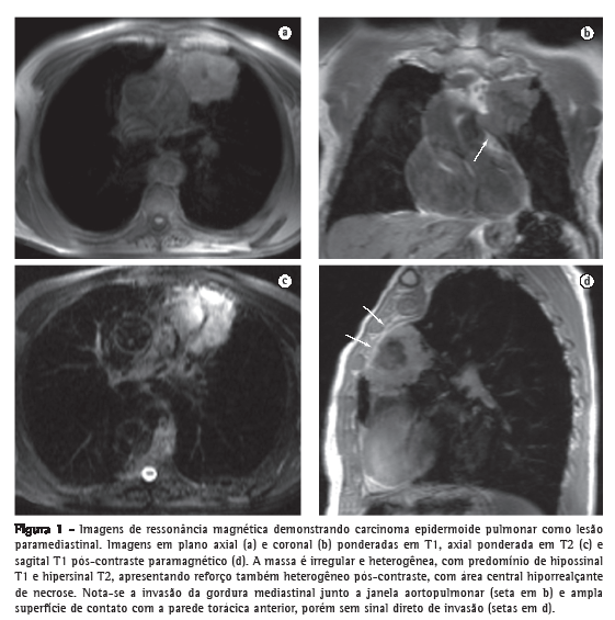 Em geral, o carcinoma broncogênico aparece nas imagens de RM como lesão sólida irregular, de hipointensa a isointensa na ponderação em T1 e hiperintensa em T2, com realce intenso após a administração do contraste, sendo heterogêneo nas lesões maiores devido a áreas de necrose central. Mesmo nas lesões fora do sulco superior, a RM pode ser melhor na identificação da invasão direta das estruturas adjacentes pela neoplasia (Figura 1), incluindo o mediastino (janela aortopulmonar e demais espaços), traqueia, brônquios, parede torácica, diafragma (tumores dos ângulos costofrênico e cardiofrênico), coração (invasão do pericárdio ou miocárdio) e grandes vasos (aorta e artérias pulmonares).Na diferenciação entre os tumores classificados como T3 ou T4, a sensibilidade da RM é semelhante à da TC, mas a RM tem maior acurácia na identificação da invasão mediastinal e hilar. Sequências dinâmicas de cine-RM podem aumentar a especificidade na detecção da invasão da parede torácica e do pericárdio. Na detecção de linfonodos mediastinais suspeitos para metástases, novas técnicas de RM têm aumentado a sensibilidade do exame. A sequência short inversion time (TI) inversion recovery (técnica T2 com supressão de gordura por inversão e recuperação) permite diferenciar entre os linfonodos metastáticos e não metastáticos em pacientes com tumores não pequenas células, sendo os primeiros mais hiperintensos e com maior sinal T2.(12-15)