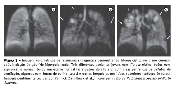 Outras doenças das vias aéreas, como asma, fibrose cística e bronquiectasias, também podem ser estudadas. Na asma, a utilização de 3He permite identificar as áreas de ventilação deficiente e mais proeminentes nos pacientes com asma grave do que nos pacientes com doença leve. Os defeitos ventilatórios regionais que melhoram após o uso de terapia broncodilatadora também podem ser demonstrados, e mesmo alterações sutis de ventilação são identificadas em pacientes asmáticos com testes funcionais normais.(31) As alterações de ventilação encontradas nos pacientes com fibrose cística apresentam excelente correlação com as alterações anatômicas da TCAR, sendo que a RM tem maior correlação com a espirometria e pode também mostrar a melhora dos defeitos ventilatórios após terapias específicas (Figura 3).(32)