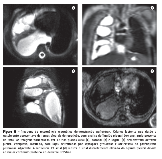 A RM é superior à radiografia e à US na detecção e na caracterização dos derrames pleurais, os quais normalmente aparecem com alto sinal T2 e baixo sinal T1, variando de acordo com o conteúdo de água e proteínas. Em comparação com a TC, a RM é também superior, principalmente na caracterização dos derrames complexos, melhor demonstrando as septações em derrames loculados, assim como na identificação de exsudatos e hemorragias, que demonstram aumento do sinal T1, e de sangramentos antigos, com áreas periféricas de hipossinal por deposição de hemossiderina (Figura 5).(38)